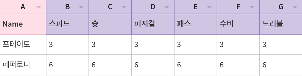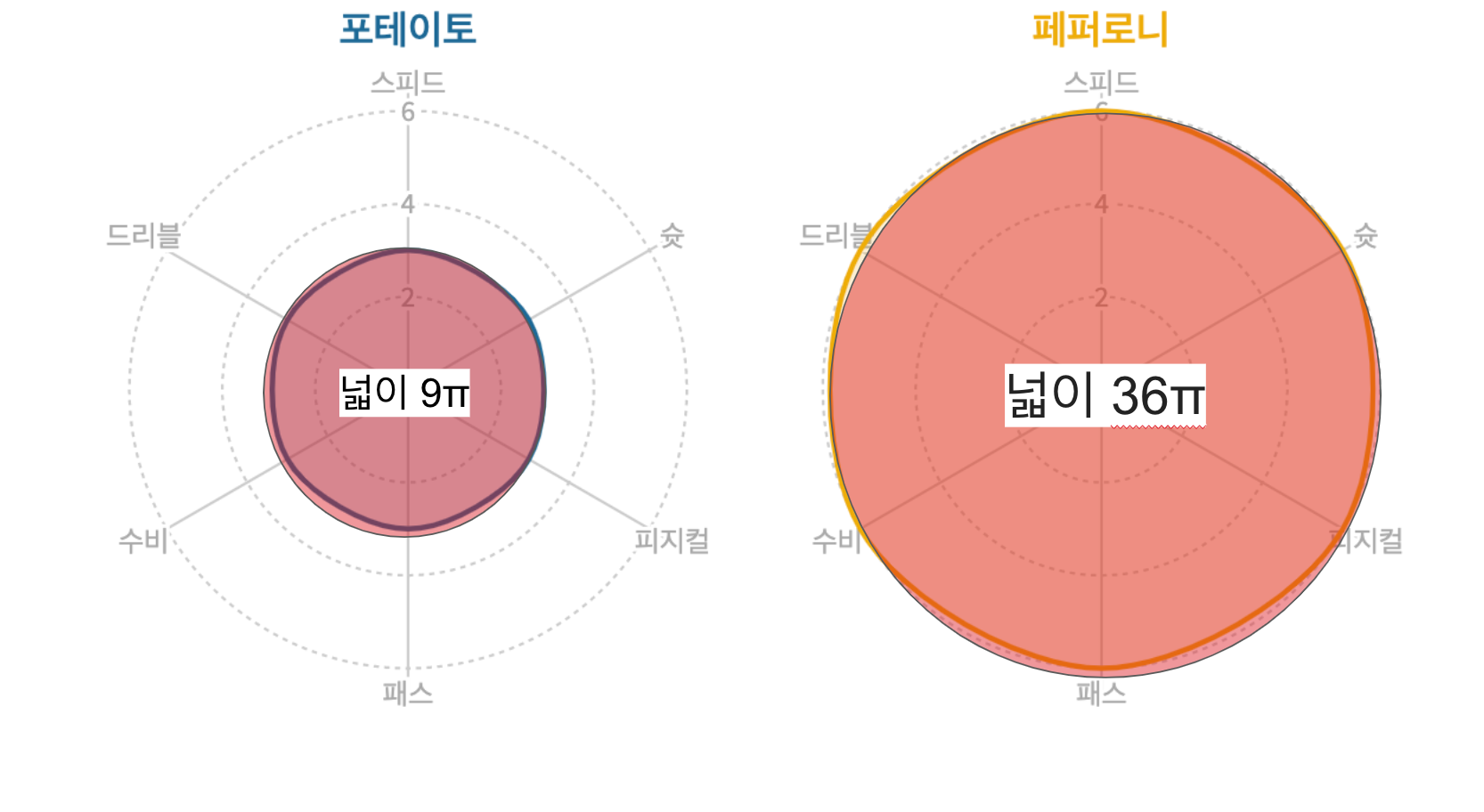 위의 표는 포테이토와 페퍼로니 선수의 스피드, 드리블, 수비, 패스, 피지컬, 슛 점수를 나타낸 표입니다. 이를 레이더 차트로 나타내 그 능력 분포를 확인해 보도록 하겠습니다. 임의로 설정해 본 포테이토 선수의 점수는 는 전 영역 3점, 페퍼로니 선수는 전 영역 6점입니다.