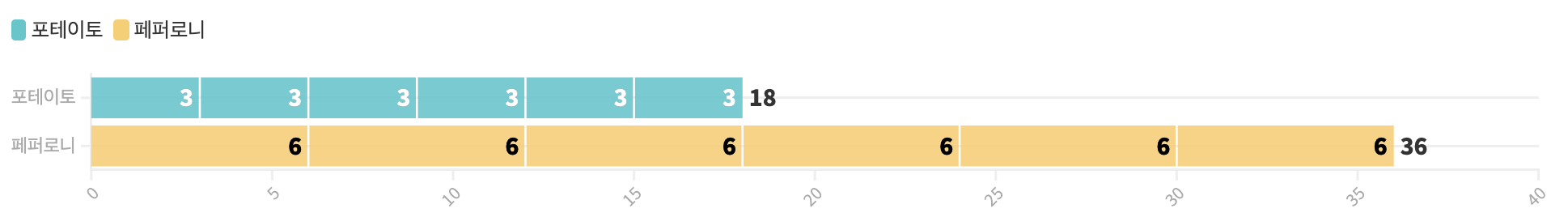 포테이토 선수는 6개의 각 지표에서 각 3점을 받은 총점 18점의 선수입니다. 페퍼로니 선수는 각 6점을 받아 36점을 받은 선수로, 막대 시각화로 비교한다면 아래와 같은 모양일 것입니다. 페퍼로니 선수가 포테이토 선수보다 약 2배 우수하다는 것을 직관적으로 확인할 수 있습니다.