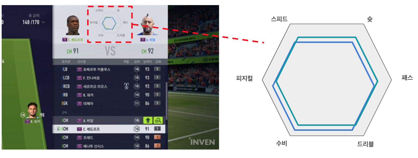 게임 피파 온라인에서는 이 게임에서는 각 선수의 능력치를 스피드, 슛, 패스, 드리블, 수비, 피지컬 등 6개로 나눕니다. 이 지표를 동심원 위에 올려 그리면 육각형이 되고, 여러 능력치가 두루 높은 선수들의 능력치는 정육각형에 가깝게 됩니다. 이로 인해 ‘육각형’ 이라는 말이 우수한 선수를 향한 최고의 찬사로 자리잡기도 했습니다.