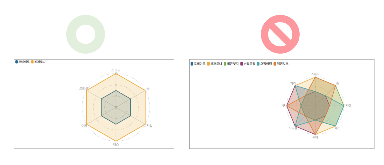 위의 왼쪽 그림처럼 한 축에 여러 도형을 포개어 표현할 수도 있습니다. 물론 이 때 너무 여러 선수를 동시에 비교한다면 오른쪽 그림처럼 비교가 매우 어려워집니다. 한 축에 그리는 도형의 수는 최대 3개가 넘지 않는 것이 좋고, 뚜렷하게 경계가 구분되는 색상을 활용하는 것이 권장됩니다.