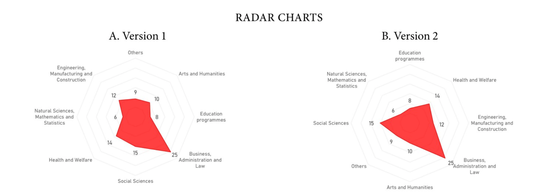 그런데 이 레이더 차트가 학계에서 요즘 논란 속에 있다고 합니다. 수십 년 동안 문제 없이 널리 쓰였지만 최근 데이터 시각화 이론이 정교화되면서 레이더 차트의 ‘정확성’에 대한 의문이 제기된 상황인데요, 일부는 차트를 시각화로 인정하지 말자는 강력한 주장까지도 펴고 있는 상황입니다. 도대체 어째서인지, 관련한 논의 역시 전달해 드리도록 하겠습니다.