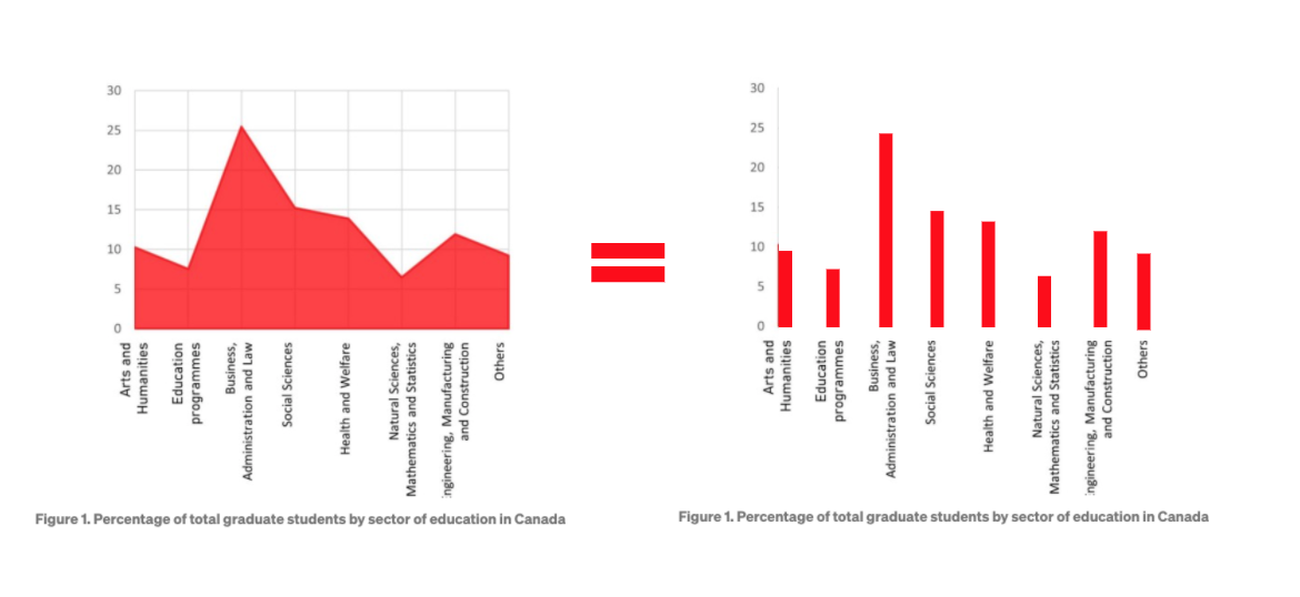 위 두 그림은 레이더 차트 A, B와 동일한 데이터를 x,y 좌표평면에 나타낸 영역 차트와 막대 차트 입니다. 레이더 차트는 왼쪽의 영역 차트처럼 ‘연속적’인 것으로 잘못 이해되는 경향이 큽니다. 오른쪽 막대 차트처럼 각 항목은 개별적인 것으로 해석되어야 합니다.