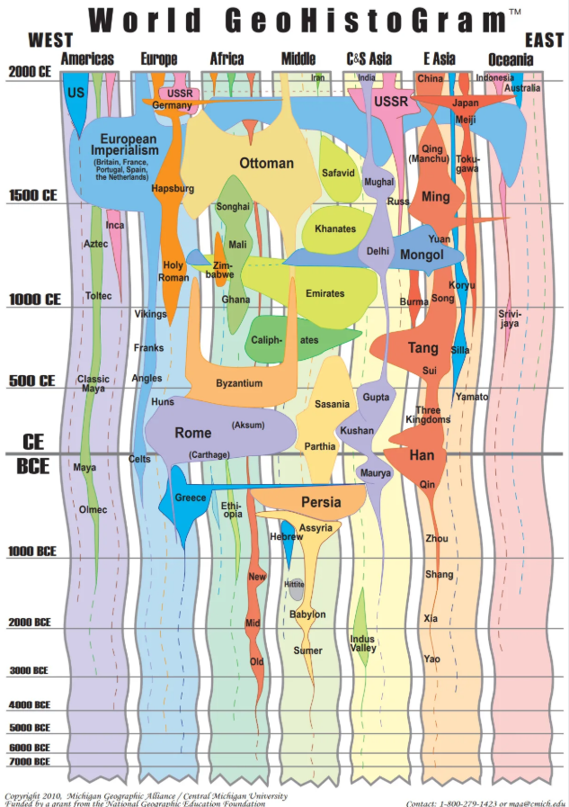 수천 년 동안 인간 사회는 끊임없이 변화해 왔습니다. 국가가 존재하기 이전에는 다양한 민족과 지역을 통치하는 형태인 ‘제국’이 존재했었는데요. 역사 속에서 가장 강력했던 제국들은 언제, 어디에서, 얼마나 크게 존재했을까요? 이 궁금증을 해결하고자 미시간주립대학의 미시간 지리 연합(Michigan Geographic Alliance)은 역사상 전 세계 제국들을 한눈에 보여주는 교육 자료 ‘World GeoHistoGram’을 제작했습니다.
