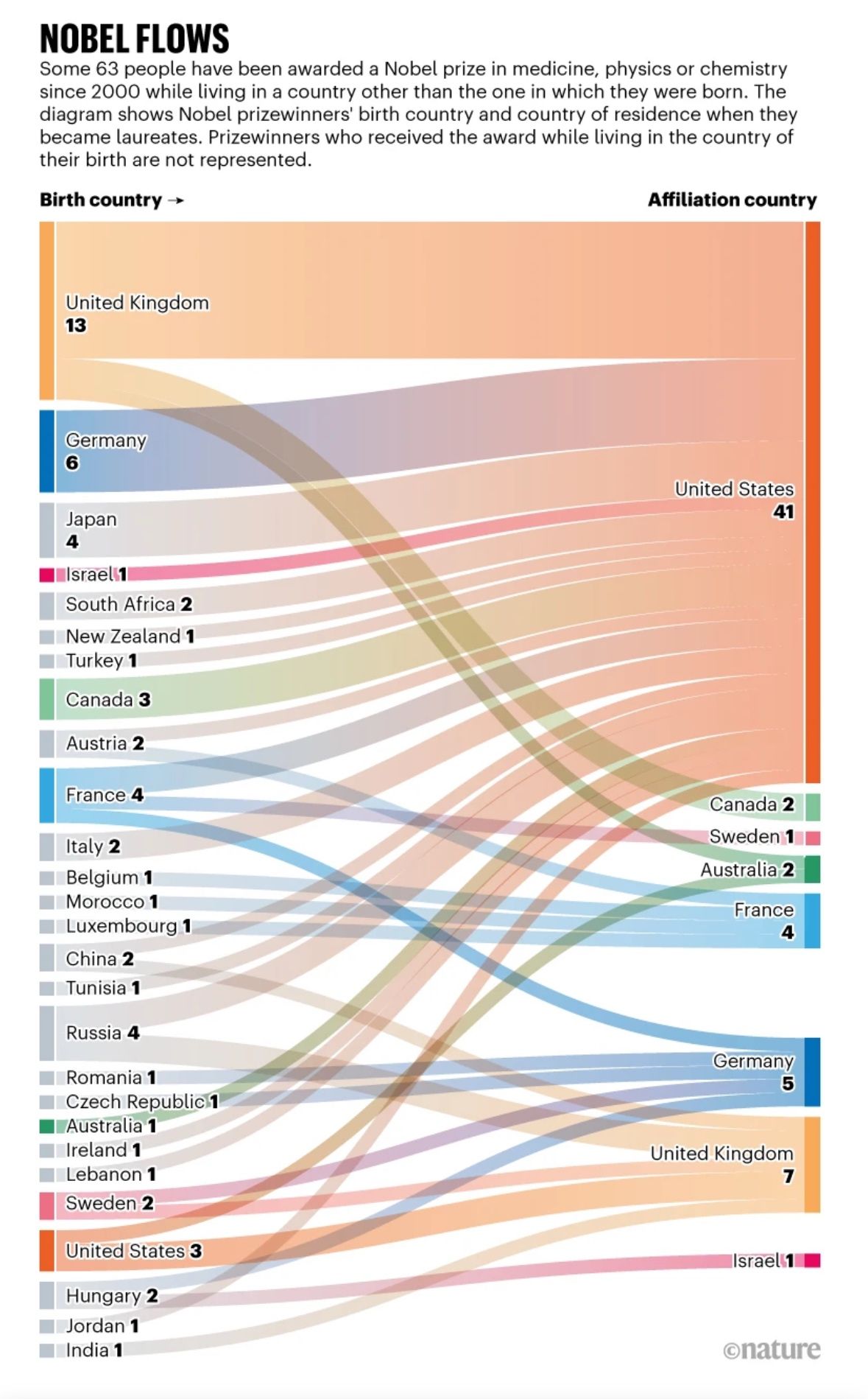 오늘 소개할 시각화는 2000년 이후 의학, 물리학, 화학 노벨상 수상자 중 국적을 변경한 수상자의 국적 이동을 보여주는 생키 다이어그램(Sankey Diagram)입니다. 차트의 왼쪽 축은 태어난 나라를, 오른쪽 축은 노벨상 수상 당시 소속된 나라를 보여줍니다. 선으로 연결된 경로를 통해 인재들의 이동을 알 수 있는데요! 왼쪽 출생국을 기준으로 보면 United Kingdom(영국) Germany(독일), Japan(일본), France(프랑스)가 굵은 선으로 표현되어, 많은 인재 이동이 있음을 알 수 있습니다.