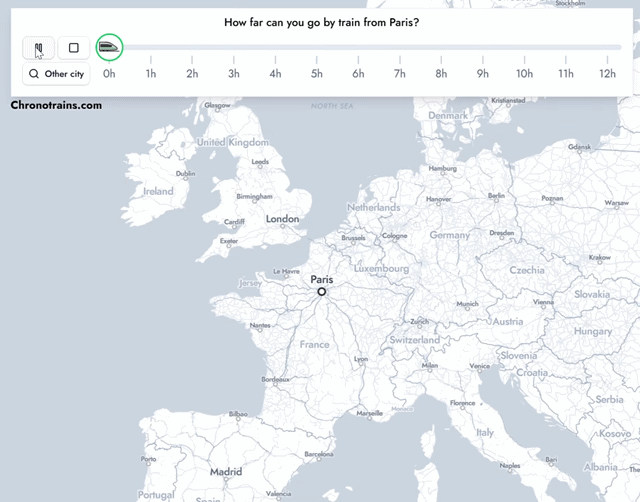 예를 들어 파리에서 출발하면 2시간 후에는 벨기에, 3시간 후에는 런던 그리고 5시간 이동하면 스위스, 마르세유까지도 이동할 수 있다는 것을 알 수 있네요! 소요 시간별로 도달할 수 있는 도시와 국경이 확장되는 모습으로 여행의 체감 거리를 한 번 더 실감하게 되는데요.