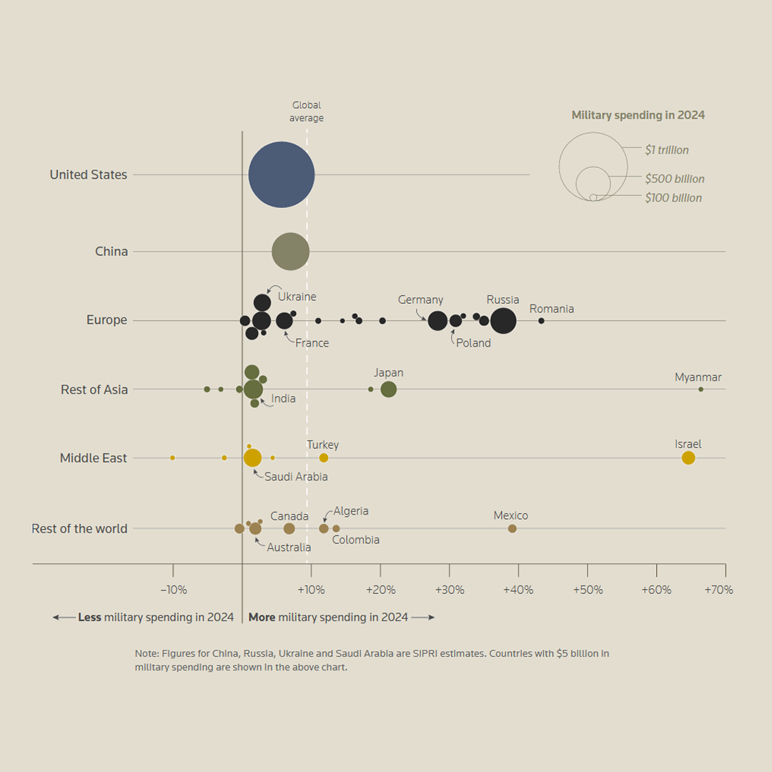 오늘 소개할 시각화는 국가별 군사비 지출 변화율을 비교한 점 나열 차트(Dot Strip Plot)입니다. X축은 2023년 대비 2024년 군사비 지출 변화율(%)을, Y축은 국가 혹은 대륙을 나타냅니다. Y축 항목마다 점의 색을 달리해 구분했습니다. 점의 크기는 각 국가의 2024년 총 군사비 지출액에 비례하게 표현했는데요. 미국, 중국, 러시아 순으로 군사비 규모가 크다는 사실을 확인할 수 있습니다.