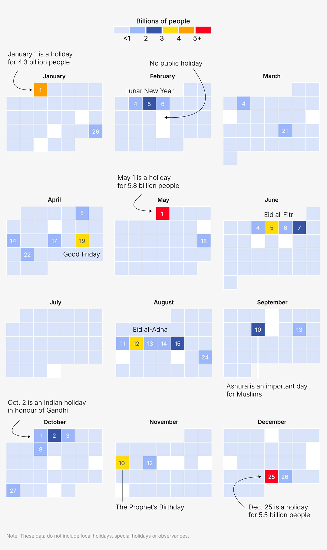 오늘 소개할 시각화는 국가별 공휴일 날짜 데이터를 인구 기준으로 집계해 표현한 캘린더 히트맵입니다. 1월부터 12월까지 월별 달력 위 각 날짜에 공식적으로 쉬는 인구 규모를 색상으로 표현했습니다. 색상 범례는 이미지 가장 상단에 있는데요. 10억 명 미만이 쉬는 날은 연한 파란색, 50억 이상이 쉬는 날은 빨간색으로 나타냈습니다. 시각화 결과를 보면, 빨간색으로 표시된 날은 두 번 있는데요. 5월 1일 노동절과 12월 25일 크리스마스에 전 세계에서 가장 많은 사람이 쉬는 날임을 확인할 수 있습니다.