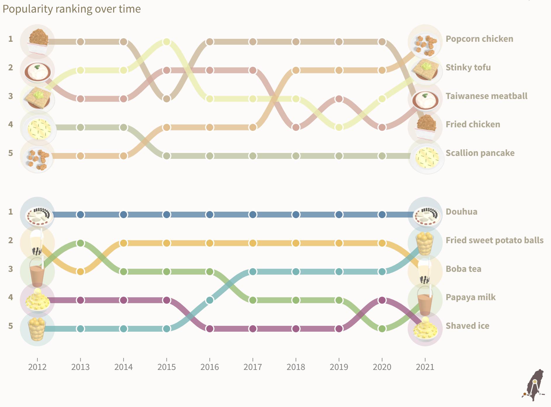 오늘의 사례는 구글의 검색량을 조회해 볼 수 있는 구글 트렌드 데이터를 이용해서 제작되었는데요! 대만에서 가장 인기 있는 길거리 음식 10가지를 식사류 5가지와 디저트류 5가지로 나누고, 2012년부터 2021년까지 종류별 인기 순위의 변화를 범프 차트로 표현했어요. 범프 차트는 시간에 따라 달라지는 항목별 데이터의 순위 변화를 표현하는 차트인데요! 선의 높낮이 변화로 데이터의 추이 변화를 파악할 수 있습니다.