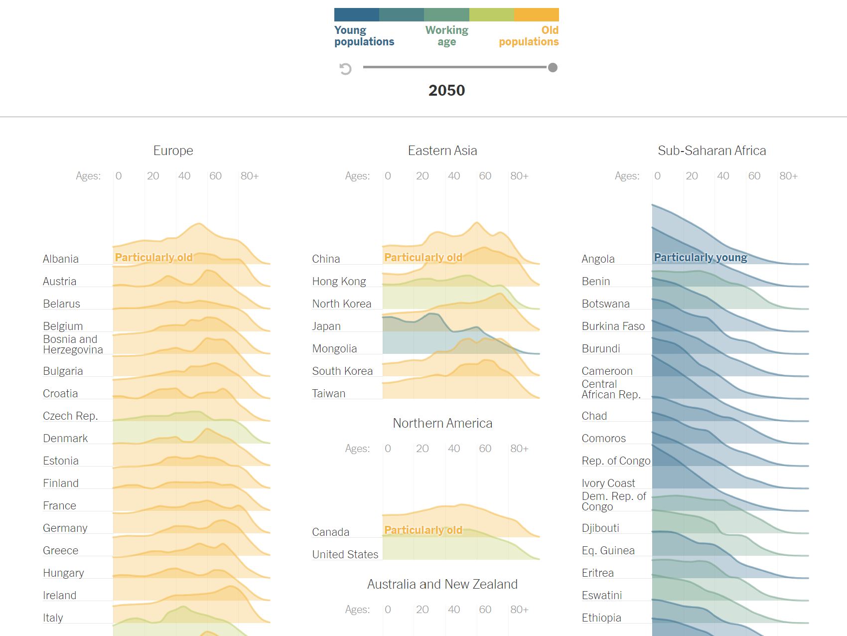 각 나라별 차트는 대륙별로 구분되고, 가장 나이가 많은 지역과 가장 나이가 어린 지역으로 한 번 더 구분되는데요! ‘나이가 많은 지역’에는 유럽, 동아시아, 북아메리카 등이 포함되고, ‘나이가 어린 지역’에는 아프리카가 포함됩니다.