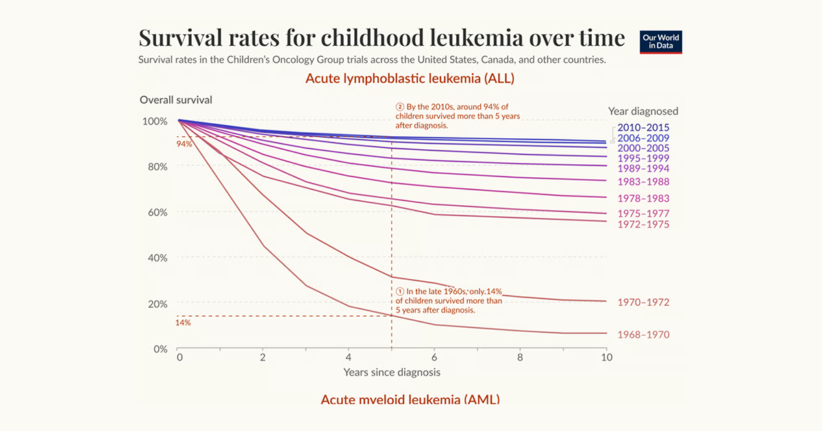 혹시 백혈병하면 어떤 이미지가 떠오르시나요? 과거에는 ‘암’이라는 단어만 들어도 두려움이 컸지만, 최근에는 치료 기술의 발전으로 희망적인 소식이 들려오고 있습니다. 백혈병을 앓고 있는 어린이의 생존율이 지난 50년간 극적으로 증가해오고 있습니다. 오는 9월 4일은 세계 백혈병의 날(World Blood Cancer Day)로 더 뜻깊은데요! 시각화 차트를 통해 더 자세히 들여다볼까요?