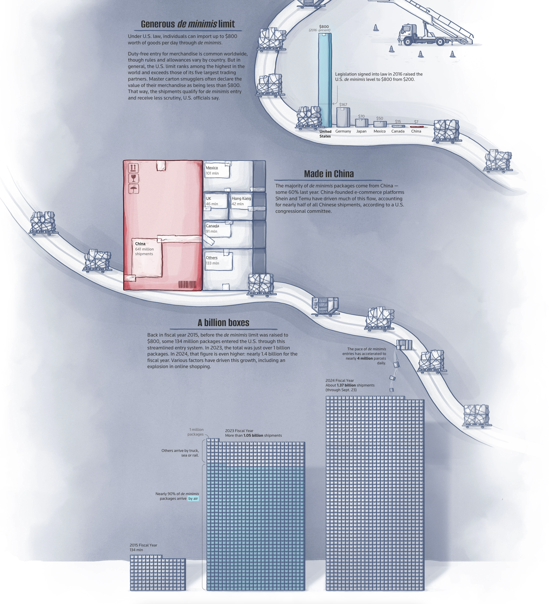 오늘은 미국으로 들어오는 소포의 규모를 시각화한 인포그래픽을 소개해 드리려 합니다. 먼저 사례 상단의 막대 차트는 ‘de minimis’ 소포, 즉 엄격한 세관 보고가 면제되는 상품 금액의 한도를 막대의 길이로 나타냈습니다. 가장 왼쪽의 막대가 미국의 한도를 나타내는데요. 2016년에 미국은 한도를 200달러에서 800달러로 대폭 늘리면서, 다른 나라들과 비교했을 때 훨씬 큰 금액의 상품을 개인이 자유롭게 들여올 수 있도록 허가했습니다. 800달러 미만의 소포에 대한 규제가 약화되면서, 그 안에 펜타닐 원료를 숨겨올 가능성은 커지게 된 것이죠!