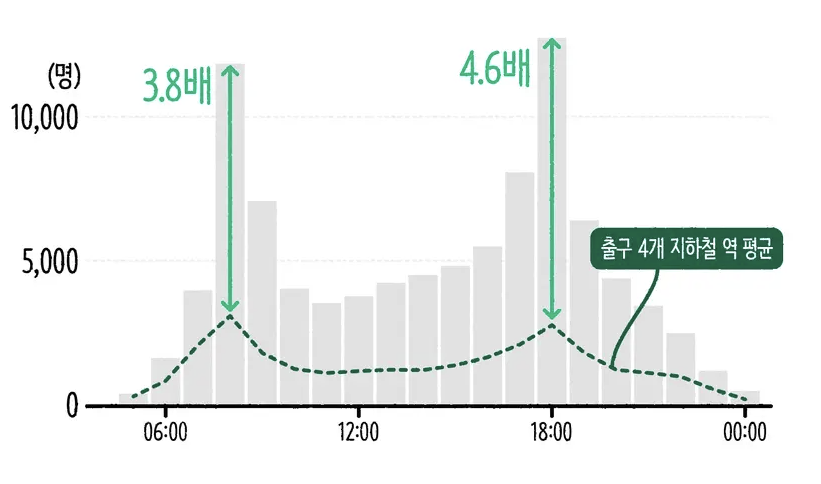 문제는 이렇게 많은 인원이 같은 출구를 통해 역을 드나든다는 점인데요. 성수역에는 총 4개의 출구가 설치되어 있습니다. 사례에서는 성수역과 같이 출구가 4개인 다른 역들의 평일 평균 이용객 수를 점선의 라인 차트로 나타냈는데요. 막대 차트와 라인 차트의 높이를 비교하면, 출퇴근 시간대에 이용객 수의 차이가 가장 큰 것을 파악할 수 있습니다. 퇴근 시간대인 오후 6~7시에는 성수역이 비슷한 규모의 다른 역들에 비해 4.6배나 많은 이용객을 수용하고 있네요!
