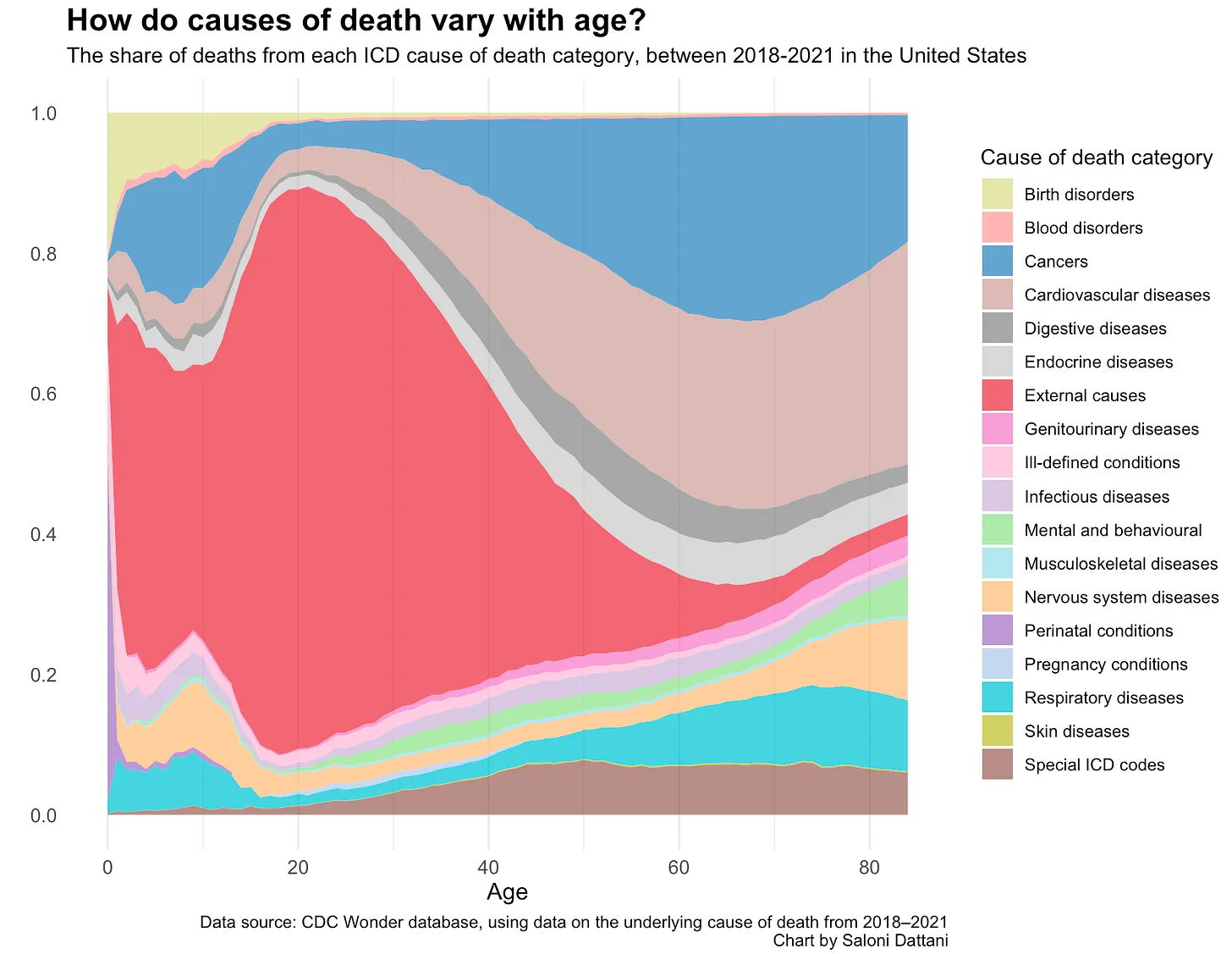 이 시각화는 미국의 2018-2021년 연령별 사망 통계를 활용한 100% 누적 영역 차트입니다. X축에 10대 단위의 연령대를 표시하고, Y축의 끝을 100%로 설정하여 연령대별 사망 원인 비율을 표시했는데요! 오른쪽 범례를 참고하여 18가지의 사망 원인을 색으로 구분할 수 있습니다. 이 시각화에서 가장 눈에 띄는 부분은 외부 요인(External causes)를 나타내는 붉은색 영역인데요! 20대에서 가장 큰 비율을 가지다 연령이 높아짐에 따라 점점 작아지는 모습을 볼 수 있습니다. 반면 암(Cancers)을 나타내는 푸른색 영역과 바로 붙어있는 심혈관 질환(Cardiovascular diseases)을 나타내는 분홍색 영역은 20대에서 비교적 작지만 6-80대에서는 가장 크게 확장하는 것을 볼 수 있습니다. 20대에서는 암과 심혈관 질환보다 외부 요인으로 인해 사망하는 비율이 더욱 크고, 고령층에선 외부 요인보다 암과 심혈관을 비롯한 다른 이유로 사망하는 경우가 많다고 해석할 수 있어요.