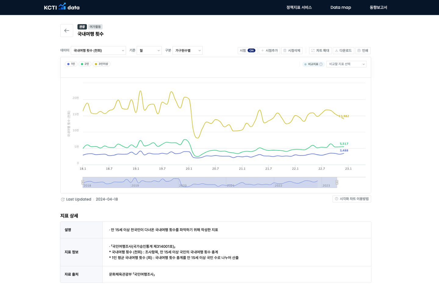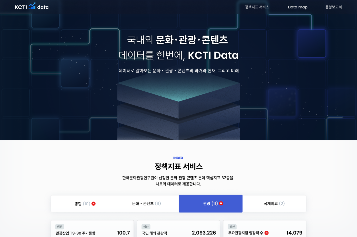 신규 지표 추가 시 기존 서비스의 핵심이었던 지표별 데이터 및 시각화 제공 구조는 동일하게 유지하면서도 데이터 인사이트 도출에 도움이 되는 부가 요소를 더해 서비스의 활용도를 높이고자 하였습니다. 나아가 신규 메뉴로 국내·외에서 생산되는 문화·관광콘텐츠 관련 지표 현황을 시각화로 제공하는 ‘Data Map', 관련 분야의 리포트를 제공하는 ‘동향보고서' 메뉴를 추가하여 기존보다 넓은 범위의 문화·관광·콘텐츠 데이터 활용을 제안하는 서비스로의 고도화를 진행하였습니다.