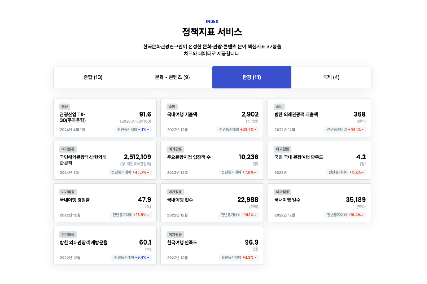 서비스 개편 이후 핵심 정책 지표 서비스를 활용하던 기존 사용자들에게 보다 넓은 범위의 정보로서 문화·관광·콘텐츠 관련 지표 현황, 동향보고서 등을 제공할 수 있게 되었습니다. 개별 정책지표 화면에서 보다 종합적인 데이터 인사이트를 도출할 수 있게 된 것, 서비스 내에서 직접 제공하는 지표 이외에도 관련 분야의 다양한 지표가 있다는 정보를 이용할 수 있다는 것에 큰 반응을 얻었습니다.