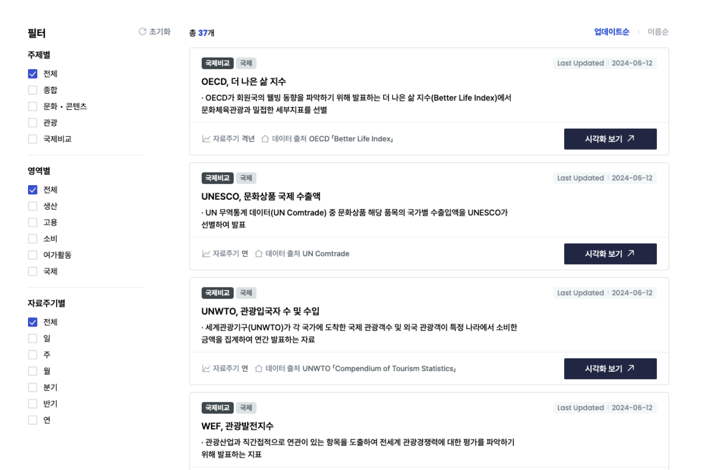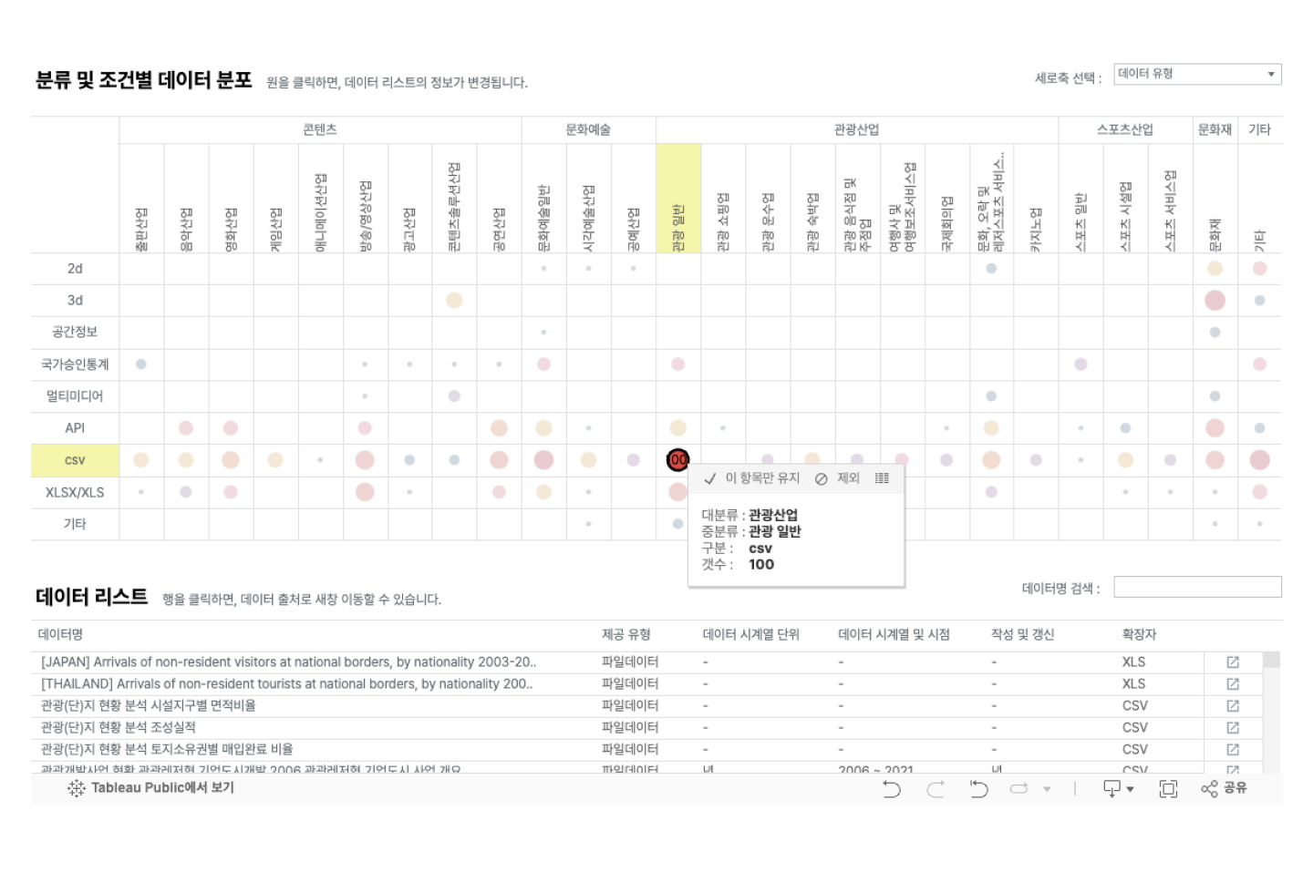 나아가 상단의 차트에서 특정 조건의 원을 클릭하면, 해당 조건에 속한 데이터 리스트를 하단의 영역에서 바로 확인 할 수 있도록 하였습니다. 사용자는 개별 원을 클릭하여 세부 조건별 상세 지표 리스트를 확인할 수 있습니다. 특히 리스트에는 각 지표별 출처 링크로 이동할 수 있는 기능을 더해, 사용자가 데이터 출처로 바로 이동하여 데이터 활용을 할 수 있도록 하였습니다. 이는 고도화 프로젝트 중요한 목적인 문화·관광·콘텐츠 분야의 데이터 활용도를 높이는 데 중요한 역할을 하였습니다.